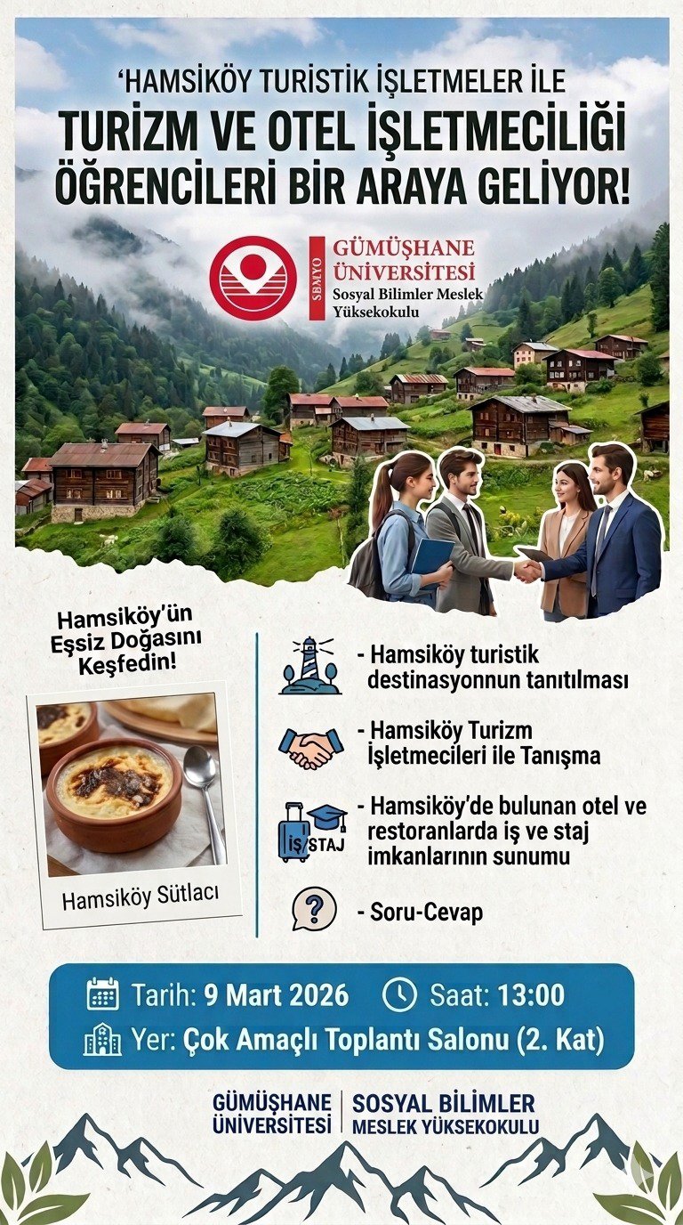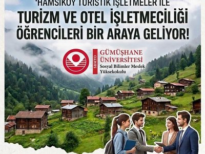 Gümüşhane Üniversitesi Sosyal Bilimler Meslek Yüksekokulu olarak, turizm sektörünün dinamiklerini yerinde tanımanız ve kariyer yolculuğunuza yön vermeniz amacıyla özel bir etkinlik düzenliyoruz. Hamsiköy Turistik İşletmeleri ile Turizm ve Otel İşletmeciliği programı öğrencilerimizi bir araya getireceğimiz bu buluşmada, sektör profesyonellerinden doğrudan bilgi alma ve kariyer fırsatlarını değerlendirme şansı yakalayacaksınız. Program akışı aşağıdaki gibi gerçekleşecektir;